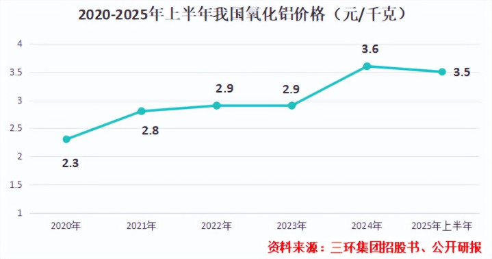 不过,2024年以来,由于上游铝土矿资源供应逐渐紧张,导致我国氧化铝价格不断上升。截至2025年上半年,我国氧化铝均价依然维持在3.5元/千克的较高水平。