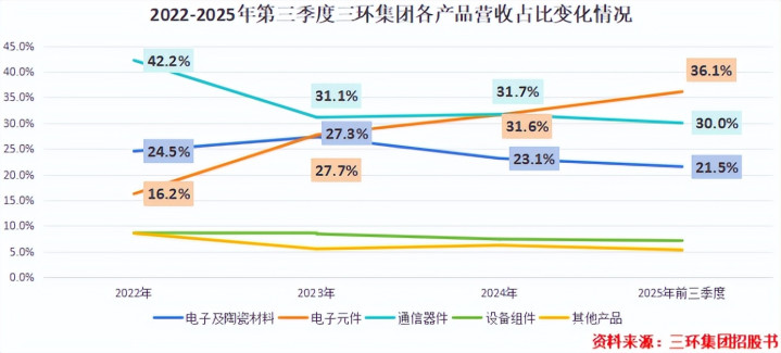 三环集团也抓住了这个机遇,自从切入MLCC领域后,不断提高其业务占比。2022-2025年第三季度,公司包含MLCC产品在内的电子元件产品,营收占比已从16.2%上升至36.1%,成为其最重要的营收来源。