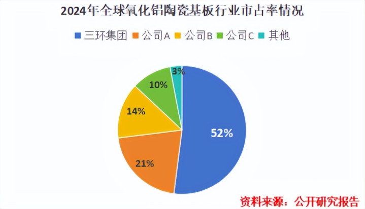 全球氧化铝陶瓷基板行业的竞争格局高度集中,2024年,97%的市场集中于前五大公司手中。其中,三环集团市占率52%,位居全球第一,拥有无可争议的市场话语权。